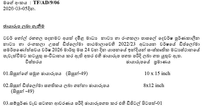 ටවර් හෝල් රඟහල පදනමට අයත් දමිළ මාධ්ය නාට්ය හා රංගකලා පාසලේ දෙවර්ෂ පුර්ණකාලීන නාට්ය හා රංගකලා උසස් ඩිප්ලෝමා පාඨමාලාවෙහි 2022/23 අධ්යයන වර්ෂයේ ඩිප්ලෝමා සමර්පණෝත්සවය සදහා චායා රුප ලබාගැනීම