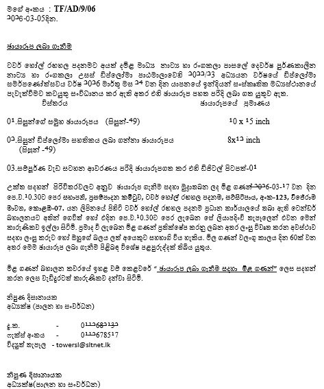 ටවර් හෝල් රඟහල පදනම මගින් සිදු කිරීමට නියමිත කලාකරු අනුස්මරණ උත්සවය සදහා වේදිකාවේ සවි කිරීම සඳහා Digital Screen Full HD P3 (10 Feet x 12 Feet) Video Screen 4K ආකාරයේ LED තිරයක් සවිකිරීම සඳහා මිළ ගණන් කැඳවීමට පාලනාධිකාරිය තීරණය කර ඇත.