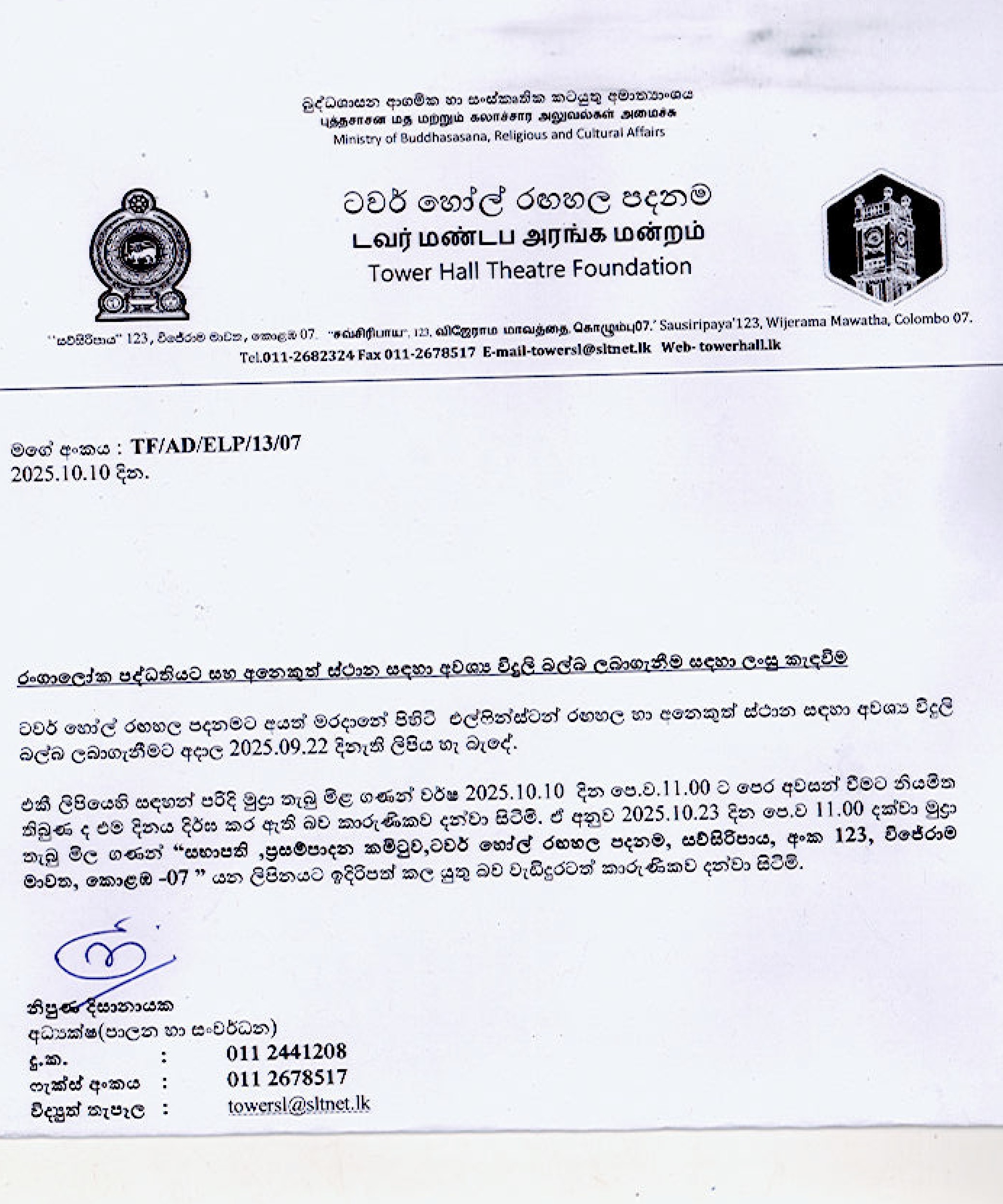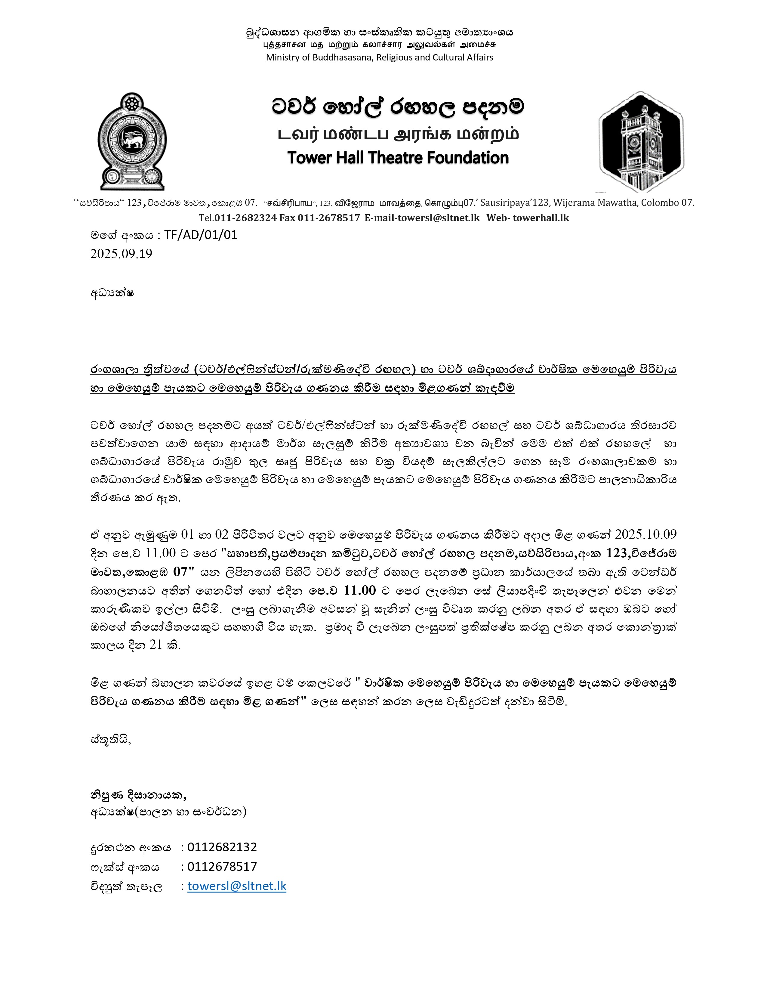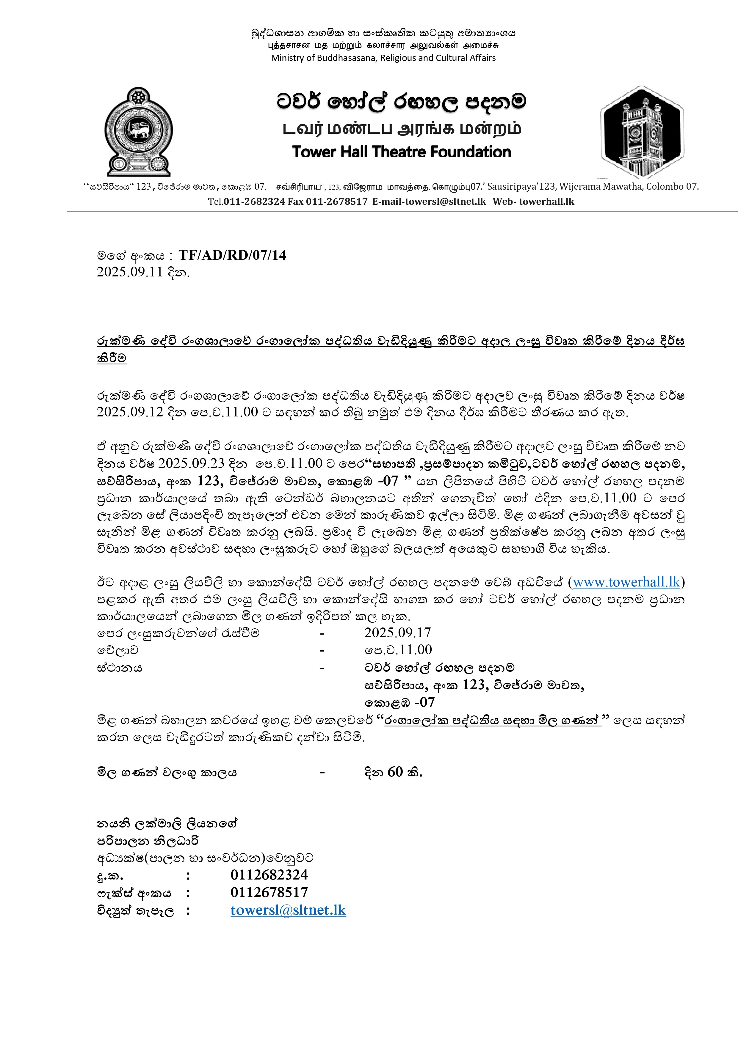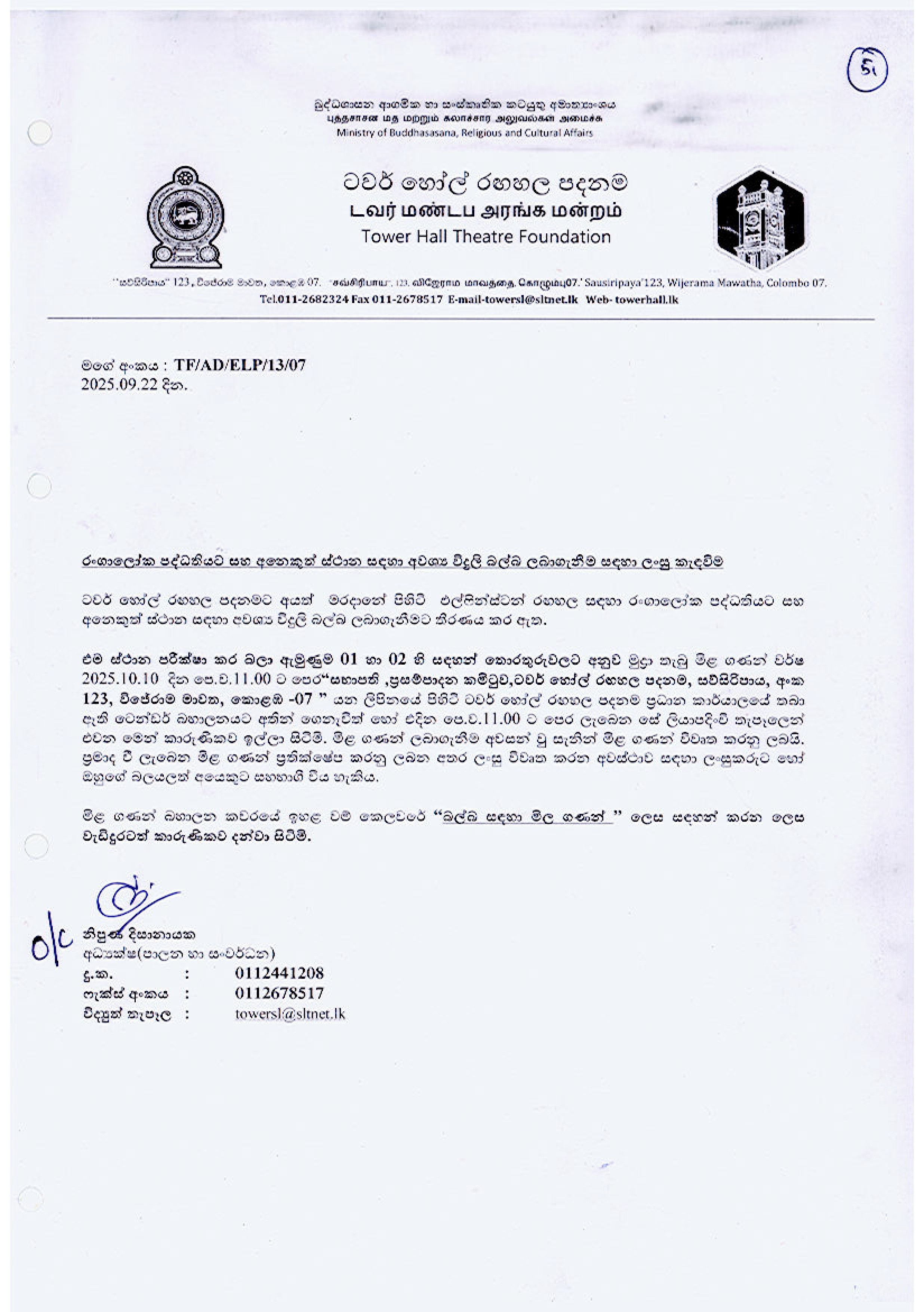 The letter dated 2025.09.22 relating to the procurement of electric bulbs for the Elphinstone Theatre in Maradana and other places belonging to the Tower Hall Theatre Foundation is hereby closed. As stated in the said letter, the sealed bids were to close before 11.00 a.m. on 10.10.2025, but that date has been extended. Accordingly, I further inform you that sealed bids can be submitted to the address “Chairman, Procurement Committee, Tower Hall Theatre Foundation, Sawsiripaya, No. 123, Wijerama Mawatha, Colombo-07” up to 11.00 a.m. on 23.10.2025.