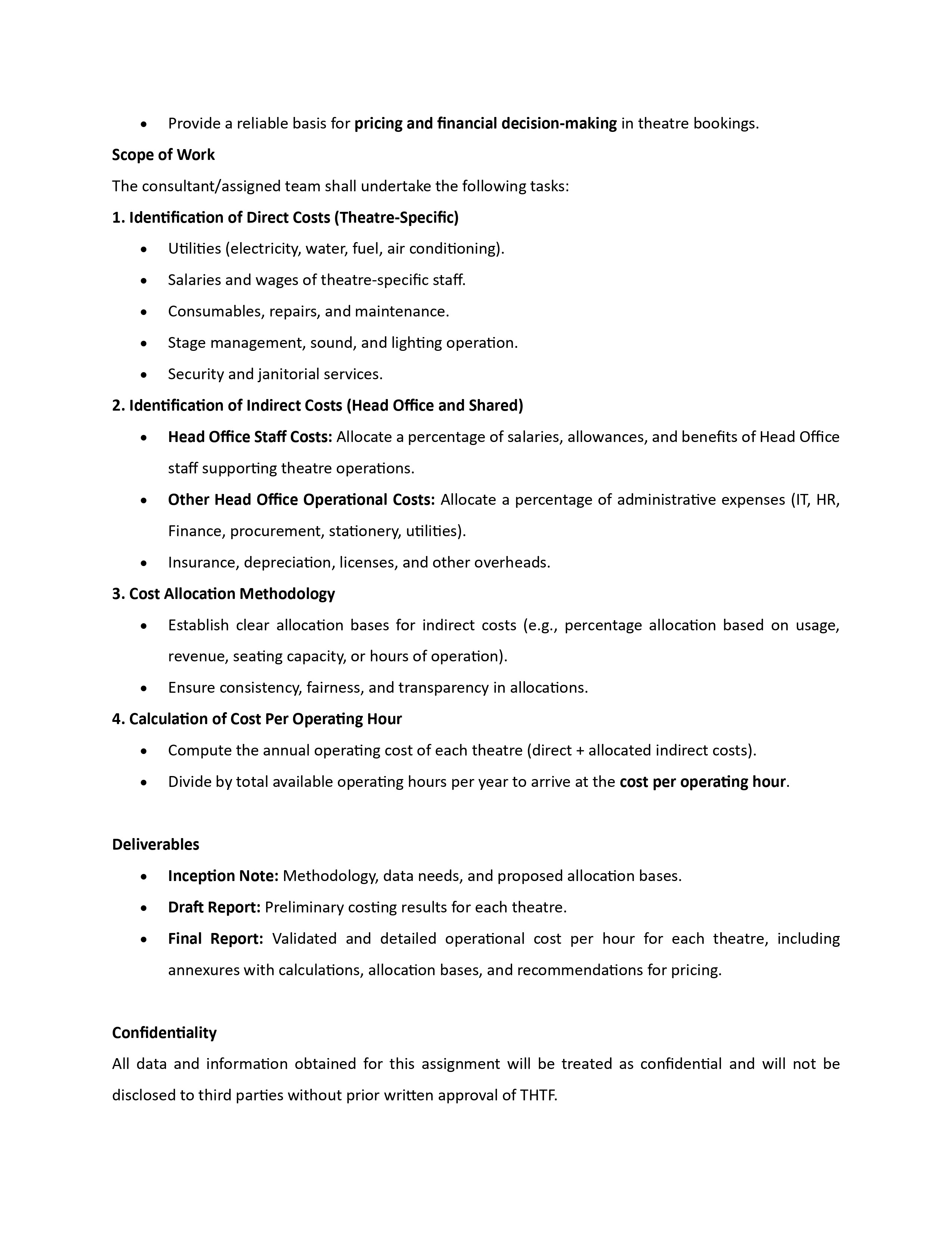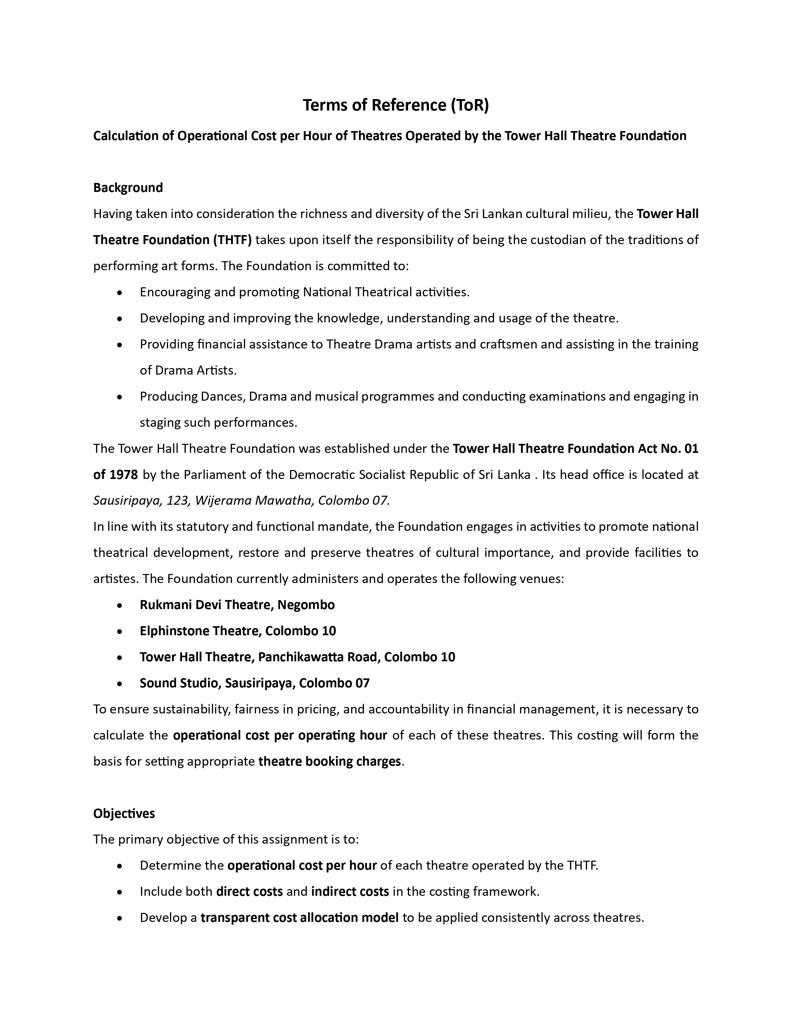 Call for quotations to calculate the annual operating cost and operating cost per operating hour of the three theatres (Tower/Elphinstone/Rukmani Devi Theatre) and Tower Studio