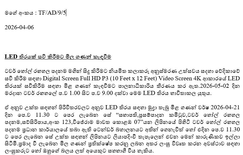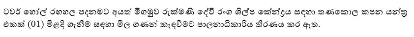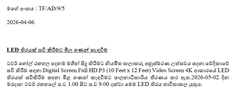 ටවර් හෝල් රඟහල පදනම මගින් සිදු කිරීමට නියමිත කලාකරු අනුස්මරණ උත්සවය සදහා වේදිකාවේ සවි කිරීම සඳහා Digital Screen Full HD P3 (10 Feet x 12 Feet) Video Screen 4K ආකාරයේ LED තිරයක් සවිකිරීම සඳහා මිළ ගණන් කැඳවීමට පාලනාධිකාරිය තීරණය කර ඇත.