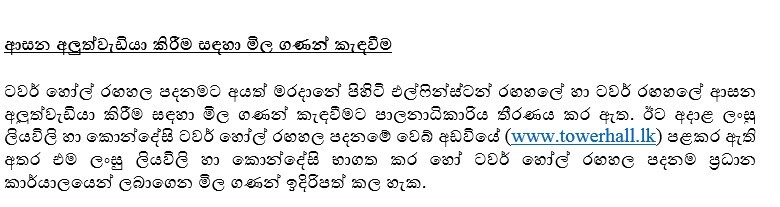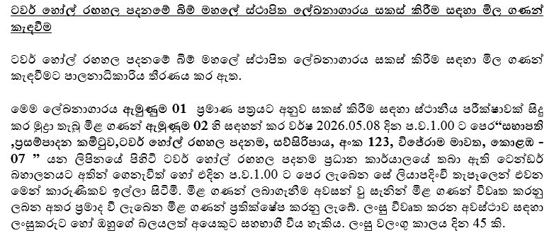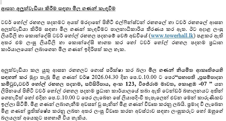 ටවර් හෝල් රඟහල පදනමේ බිම් මහලේ ස්ථාපිත ලේඛනාගාරය සකස් කිරීම සඳහා මිල ගණන් කැඳවීම