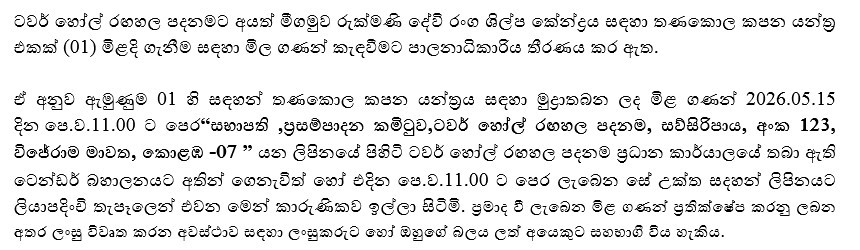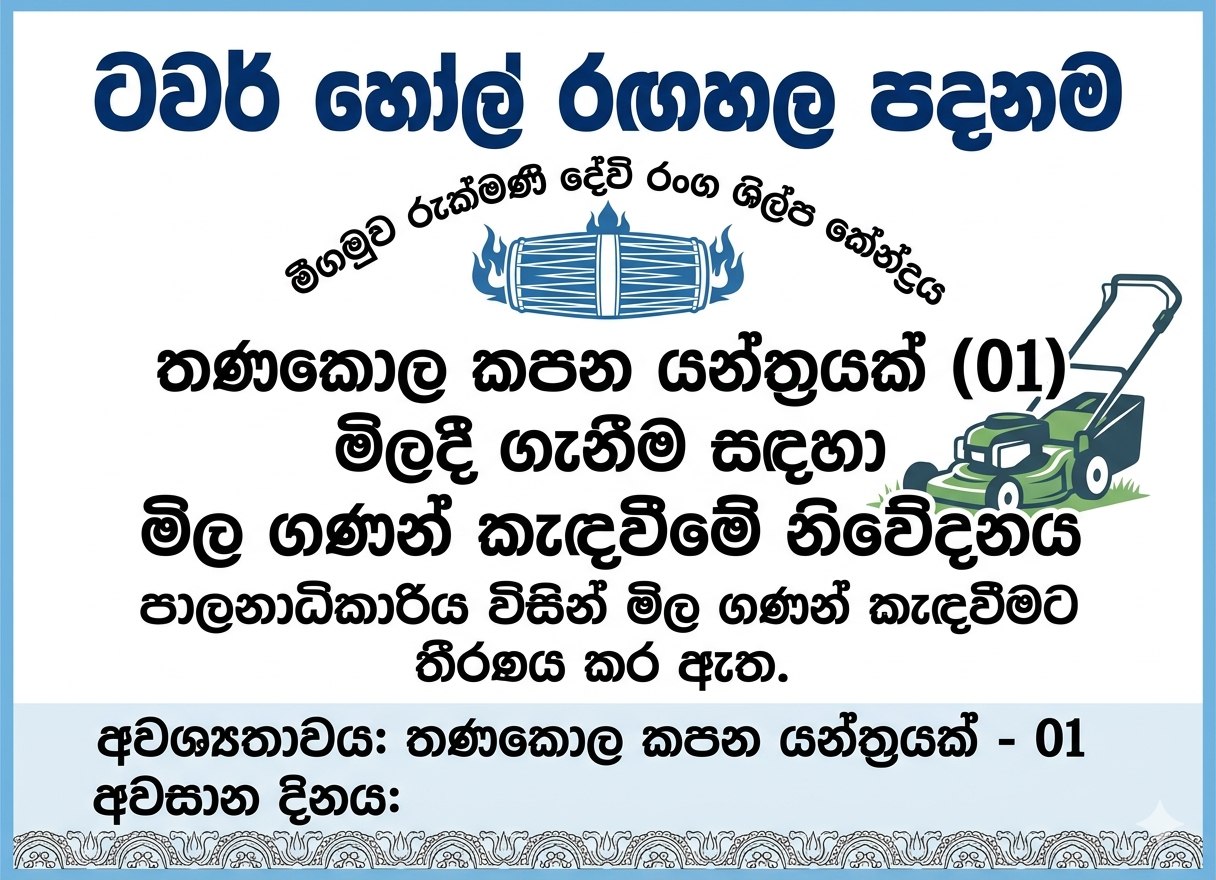 ටවර් හෝල් රඟහල පදනමට අයත් මීගමුව රුක්මණි දේවි රංග ශිල්ප කේන්ද්රය සඳහා තණකොල කපන යන්ත්ර එකක් (01) මිළදි ගැනීම සඳහා මිල ගණන් කැඳවීමට පාලනාධිකාරිය තීරණය කර ඇත.