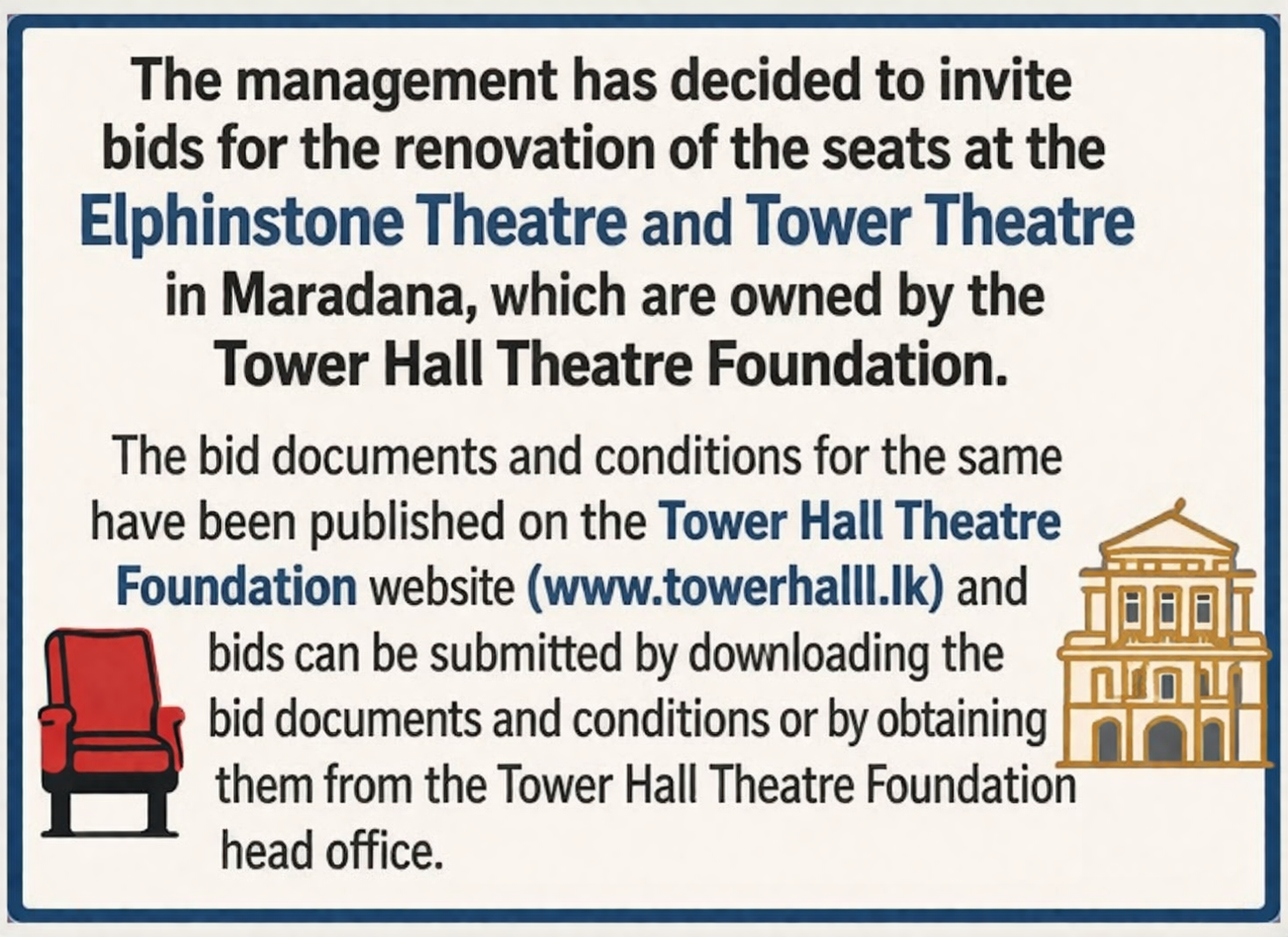 ටවර් හෝල් රඟහල පදනමට අයත් මරදානේ පිහිටි එල්ෆින්ස්ටන් රඟහලේ හා ටවර් රඟහලේ ආසන අලුත්වැඩියා කිරීම සඳහා මිල ගණන් කැඳවීමට පාලනාධිකාරිය තීරණය කර ඇත.